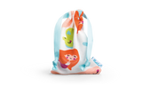 The Merula Cup mermaid is an intense royal blue with a matching cotton pouch made out of an especially soft, light-colored jersey printed with large mermaids and other colorful ocean creatures. A pale blue ribbon is used to close the pouch and hang it up to store the cup in a safe and airy spot between your periods.